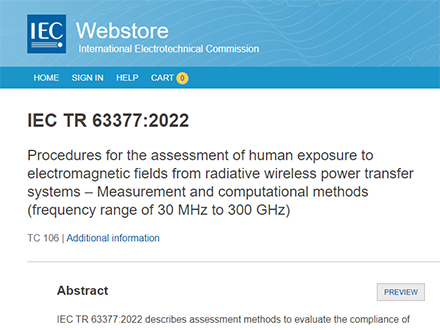 2022年11月4日,國際電工委員會(IEC)發布IEC TR 63377:2022《人體暴露于輻射式無線電能傳輸系統產生的電磁場的評估程序-測量和計算方法(頻率范圍從30MHz至300GHz)》。